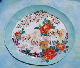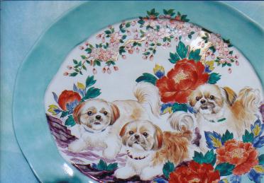 | {色絵大皿/シーズー} 40cm近くある大皿にファミリーを描きました 牡丹の花があでやかです |