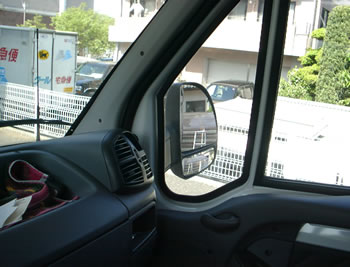右サイドミラーの視界です。ドアミラーは視線の移動量が大きく好きになれません。下部のサブミラーはメインミラーの死角となる並走車や合流時の右斜め後方確認に有効ですが、サイズが小さい上に曲面ミラーで距離感が掴み難いので注意が必要です。安全性向上策として前車ハイマーに取付けていたハイウェイミラーを増設する予定です。 |