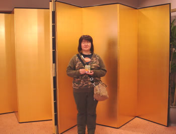 何故か金屏風好きの妻ちゃん。この後部屋へ戻り、ベッドでうたた寝してたらチェックアウト時刻の12時(遅!)が迫っていたので、急いで退出準備。