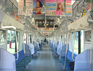 車内はこんな感じです。同じ30000系でも座席端部の袖仕切り形状が違う車両もあります。ちなみにこの編成は前期タイプ。 |
