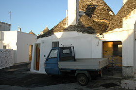 ●アルベロベッロでは大雨の中をオリーブ工場を見学 アルベロベッロへ到着したがそとはものすごい雨。この町も観光用として新しく建てられた町と昔ながら今でも住居として使用している古い町とに分かれている。新しい町の方は、主にお土産屋さんになっているので生活感というのが感じられない。雨の中を散策するが、洋服はびしょびしょ。ガイドさんの案内で古い町に残るオリーブ当時の工場を見学した。工場といってもとんがり屋根の家の中にり、道具は手作りで人力によるオリーブ搾り作業場みたいだ。この日は早めに引き上げてホテルへ避難。翌朝、一転して雲ひとつない晴天。 朝食前にもう一度町を歩くことにした。ホテルから10分くらいでアルベロベッロの町へ出る。 雨上がりの町は空気もクリアで、昨日とはうって変わった景色が見られた。細り路地、とんがり屋根が続く家々。軒下には洗濯物が干してあり、生活感がただよってくる。